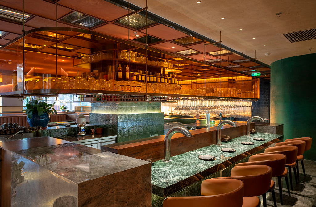入口的体验非常神秘:通过有机洞穴造型的玄关,会抵达开阔的主用餐区;进来后能看到展示吧台:吧台结合空间中心的大柱子设计,消解了大柱子的体量;悬吊的红色半透明亚克力酒架既展示了主理人的藏酒,又是空间中视觉的亮点。红色也暗示了本店主题:炭烤牛肉。